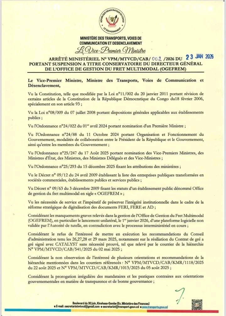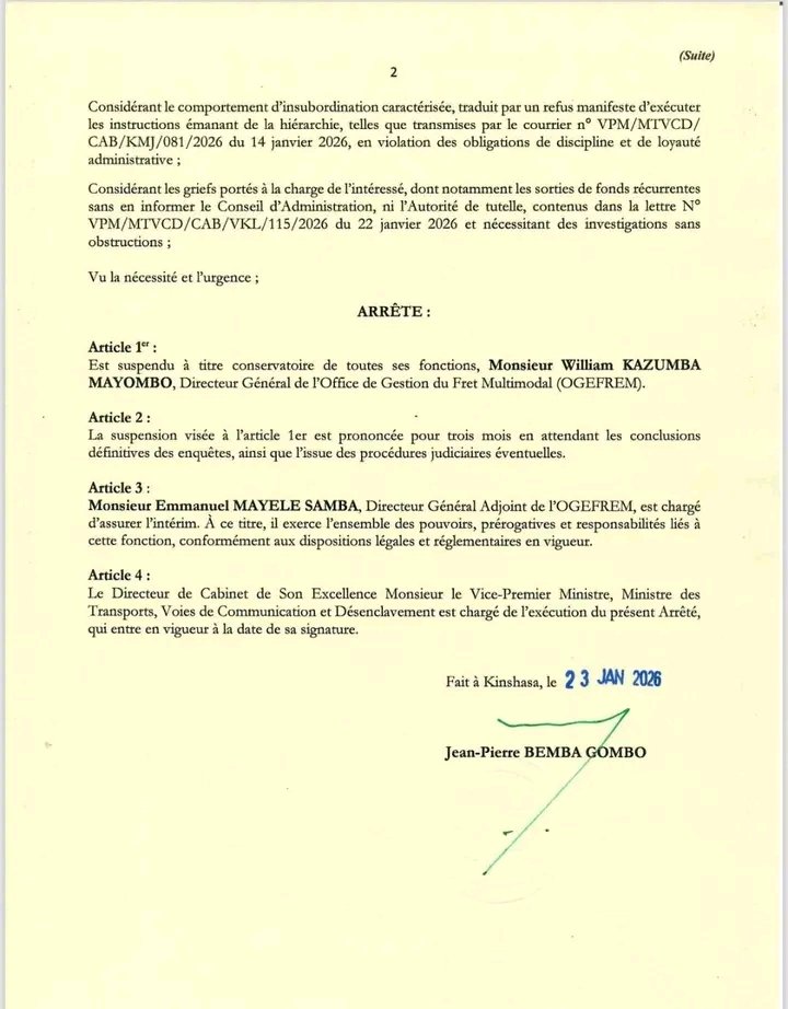 AccueilA la UneAffaire présumé détournement des fonds : Jean-Pierre Bemba suspend le DG de... A la UneSociété Affaire présumé détournement des fonds : Jean-Pierre Bemba suspend le DG de l’OGEFREM , William Kazumba Mayombo ( Arreté) By redaction 23 janvier 2026 0 0 Partager FacebookTwitterPinterestWhatsApp Partager FacebookTwitterPinterestWhatsApp Article précédentDélinquance taxis Beni-Kasindi : L’alerte de BETRANSCO au gouverneurArticle suivantAffaire assassinats à Mongala : Loleka Alele condamné à la peine de mort redactionhttp://www.rtnc.cd RELATED ARTICLES A la Une Kasaï Central : Plus d’un million d’enfants attendus à la campagne de vaccination contre la poliomyélite 24 avril 2026 A la Une Lomami : 4 morts et 47 blessés dans un accident de circulation sur la RN2 24 avril 2026 A la Une Tanganyika : l’Ong les « Ailes du cœur » lance la campagne pour promouvoir la voix des adolescentes 24 avril 2026 LAISSER UN COMMENTAIRE Annuler la réponse Commenter : S'il vous plaît entrez votre commentaire! Nom :* S'il vous plaît entrez votre nom ici Email :* Vous avez entré une adresse email incorrecte! Veuillez entrer votre adresse email ici Site : Enregistrer mon nom, email et site web dans ce navigateur pour la prochaine fois que je commenterai. - Advertisment - Most Popular Kasaï Central : Plus d’un million d’enfants attendus à la campagne de vaccination contre la poliomyélite 24 avril 2026 Lomami : 4 morts et 47 blessés dans un accident de circulation sur la RN2 24 avril 2026 Tanganyika : l’Ong les « Ailes du cœur » lance la campagne pour promouvoir la voix des adolescentes 24 avril 2026 Kwango : l’Assemblée provinciale engage des travaux de réaménagement et d’entretien de son siège 24 avril 2026 Voir plus Recent Comments Our gallery They say that a picture is worth a thousand words, so that's why we always want to document our campaigns. Immerse yourself in our past projects, with these wonderful images taken by our volunteer photographers. VIEW GALLERY