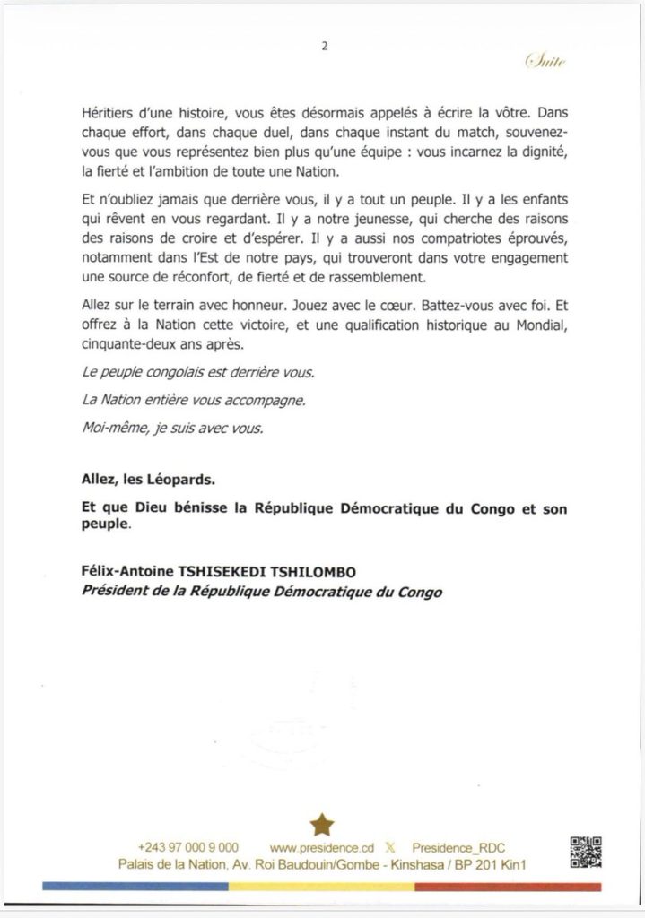AccueilA la UneBarrage mondial : Le Chef de l’État appelle les léopards à offrir... A la UneBreaking NewsSports Barrage mondial : Le Chef de l’État appelle les léopards à offrir au pays une qualification historique ( Message ) By redaction 30 mars 2026 0 0 Partager FacebookTwitterPinterestWhatsApp Partager FacebookTwitterPinterestWhatsApp Article précédentMwene-Ditu : Cérémonie de port de grade du commissaire principal de la PNC Kabamba TshisuluArticle suivantRenforcement des relations RDC-Brésil : Luiz Inácio reçu par le Chef de l’Etat redactionhttp://www.rtnc.cd RELATED ARTICLES A la Une Accueil des émigrés venus des États-Unis : Kinshasa précise qu’il s’agit d’un court séjour et non d’installation durable, ni une relocalisation permanente 18 avril 2026 A la Une Beni : les jeunes face à leurs responsabilités dans la gestion de la chose publique 17 avril 2026 A la Une RDC: Face à la crise au Moyen-Orient, le gouvernement ajuste les prix des produits pétroliers 17 avril 2026 LAISSER UN COMMENTAIRE Annuler la réponse Commenter : S'il vous plaît entrez votre commentaire! Nom :* S'il vous plaît entrez votre nom ici Email :* Vous avez entré une adresse email incorrecte! Veuillez entrer votre adresse email ici Site : Enregistrer mon nom, email et site web dans ce navigateur pour la prochaine fois que je commenterai. - Advertisment - Most Popular Accueil des émigrés venus des États-Unis : Kinshasa précise qu’il s’agit d’un court séjour et non d’installation durable, ni une relocalisation permanente 18 avril 2026 Beni : les jeunes face à leurs responsabilités dans la gestion de la chose publique 17 avril 2026 RDC: Face à la crise au Moyen-Orient, le gouvernement ajuste les prix des produits pétroliers 17 avril 2026 Ituri: le pont Masinda inauguré à Bavonkutu pour désenclaver l’axe Bavonkutu–Yedi. 17 avril 2026 Voir plus Recent Comments Our gallery They say that a picture is worth a thousand words, so that's why we always want to document our campaigns. Immerse yourself in our past projects, with these wonderful images taken by our volunteer photographers. VIEW GALLERY