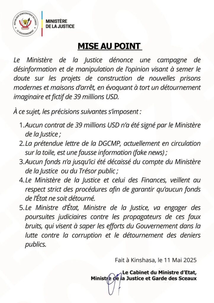 AccueilA la UneConstruction des prisons en RDC : Constant Mutamba dément un détournement présumé... A la UneBreaking NewsJustice Construction des prisons en RDC : Constant Mutamba dément un détournement présumé de 39 millions USD By redaction 12 mai 2025 0 0 Partager FacebookTwitterPinterestWhatsApp Partager FacebookTwitterPinterestWhatsApp Article précédentSud-Kivu/Santé : Les unités de traitement de choléra à l’hôpital de Nundu bénéficient d’un appui de l’AFEDEMArticle suivantIturi: Le Bourgmestre de Mbunya invite ses administrés à adhérer au civisme fiscal redactionhttp://www.rtnc.cd RELATED ARTICLES A la Une Ituri : l’école primaire Rubingo au centre d’un projet de modernisation à Boga 15 avril 2026 A la Une 13ᵉ Semaine de la Science et des Technologies : Raïssa Malu et plusieurs membres du gouvernement visitent le site retenu à l’Athénée de la... 15 avril 2026 A la Une RDC : Murat Ülkü annonce au Chef de l’Etat l’organisation de la 5ème édition du Forum diplomatique 15 avril 2026 LAISSER UN COMMENTAIRE Annuler la réponse Commenter : S'il vous plaît entrez votre commentaire! Nom :* S'il vous plaît entrez votre nom ici Email :* Vous avez entré une adresse email incorrecte! Veuillez entrer votre adresse email ici Site : Enregistrer mon nom, email et site web dans ce navigateur pour la prochaine fois que je commenterai. - Advertisment - Most Popular Ituri : l’école primaire Rubingo au centre d’un projet de modernisation à Boga 15 avril 2026 13ᵉ Semaine de la Science et des Technologies : Raïssa Malu et plusieurs membres du gouvernement visitent le site retenu à l’Athénée de la... 15 avril 2026 RDC : Murat Ülkü annonce au Chef de l’Etat l’organisation de la 5ème édition du Forum diplomatique 15 avril 2026 RDC : Un entretien de prise de contact entre le Chef de l’État et le nouveau chef de la MONUSCO 15 avril 2026 Voir plus Recent Comments Our gallery They say that a picture is worth a thousand words, so that's why we always want to document our campaigns. Immerse yourself in our past projects, with these wonderful images taken by our volunteer photographers. VIEW GALLERY