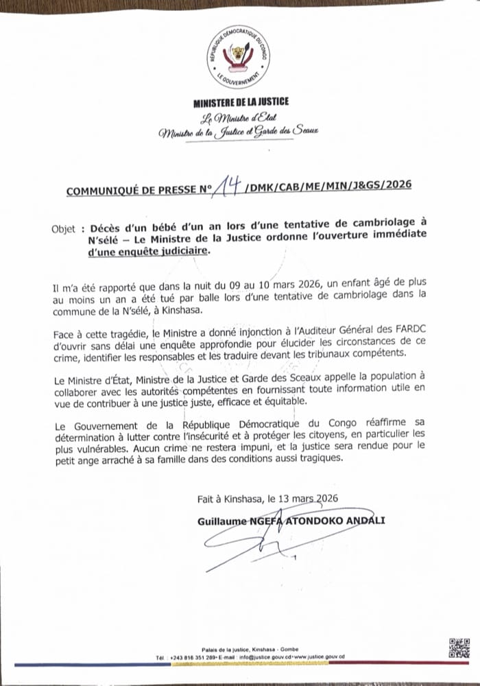 AccueilA la UneDécès d'un bébé lors d'une tentative de cambriolage à N'sele : Guillaume... A la UneJustice Décès d’un bébé lors d’une tentative de cambriolage à N’sele : Guillaume Ngefa ordonne l’ouverture immédiate d’une enquête judiciaire (communiqué) By redaction 14 mars 2026 0 0 Partager FacebookTwitterPinterestWhatsApp Partager FacebookTwitterPinterestWhatsApp Article précédentMaï-Ndombe : Fin de la grève des enseignantsArticle suivantMongala : le Gouvernement dote un lot important de médicaments aux zones de santé redactionhttp://www.rtnc.cd RELATED ARTICLES A la Une Tshuapa : Guy Isembeli dote les agriculteurs de semences ameliorées de maïs et de manioc 16 avril 2026 A la Une Tanganyika : l’UJCC organise un atelier sur la participation des jeunes et des femmes aux instances décisionnelles 16 avril 2026 A la Une Tshikapa : pose de la première pierre pour la construction du bâtiment de la DGM/Kasaï 15 avril 2026 LAISSER UN COMMENTAIRE Annuler la réponse Commenter : S'il vous plaît entrez votre commentaire! Nom :* S'il vous plaît entrez votre nom ici Email :* Vous avez entré une adresse email incorrecte! Veuillez entrer votre adresse email ici Site : Enregistrer mon nom, email et site web dans ce navigateur pour la prochaine fois que je commenterai. - Advertisment - Most Popular Réception émetteur et accessoires reçus du gouvernement provinciale du Haut Katanga 16 avril 2026 Tshuapa : Guy Isembeli dote les agriculteurs de semences ameliorées de maïs et de manioc 16 avril 2026 Tanganyika : l’UJCC organise un atelier sur la participation des jeunes et des femmes aux instances décisionnelles 16 avril 2026 Tshikapa : pose de la première pierre pour la construction du bâtiment de la DGM/Kasaï 15 avril 2026 Voir plus Recent Comments Our gallery They say that a picture is worth a thousand words, so that's why we always want to document our campaigns. Immerse yourself in our past projects, with these wonderful images taken by our volunteer photographers. VIEW GALLERY