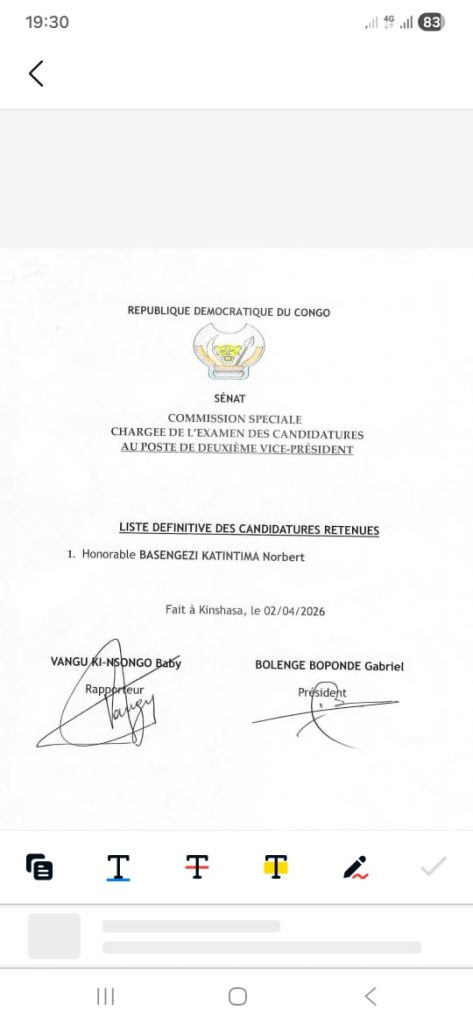 AccueilA la UneÉlection du deuxième vice-président du Sénat : Norbert Basengezi, l'unique candidat à... A la UneInstitutions Élection du deuxième vice-président du Sénat : Norbert Basengezi, l’unique candidat à ce poste (commission spéciale) By redaction 2 avril 2026 0 0 Partager FacebookTwitterPinterestWhatsApp Partager FacebookTwitterPinterestWhatsApp Article précédentGuerre au Moyen-Orient : Le Président Tshisekedi à Doha pour témoigner la solidarité du peuple congolais à l’égard du peuple qatariArticle suivantQualification au Mondial 2026 : les Léopards arrivent à Kinshasa ce samedi 4 avril, le gouvernement appelle à un accueil mémorable (Patrick Muyaya) redactionhttp://www.rtnc.cd RELATED ARTICLES A la Une Kwango : Validation de 30 infrastructures communautaires dans le cadre du projet STAR-RDC 2 avril 2026 A la Une Hommages à Simon Kimbangu : La journée du lundi 6 avril déclarée chômée et payée ( gouvernement) 2 avril 2026 A la Une Qualification au Mondial 2026 : les Léopards arrivent à Kinshasa ce samedi 4 avril, le gouvernement appelle à un accueil mémorable (Patrick Muyaya) 2 avril 2026 LAISSER UN COMMENTAIRE Annuler la réponse Commenter : S'il vous plaît entrez votre commentaire! Nom :* S'il vous plaît entrez votre nom ici Email :* Vous avez entré une adresse email incorrecte! Veuillez entrer votre adresse email ici Site : Enregistrer mon nom, email et site web dans ce navigateur pour la prochaine fois que je commenterai. - Advertisment - Most Popular Kwango : Validation de 30 infrastructures communautaires dans le cadre du projet STAR-RDC 2 avril 2026 Hommages à Simon Kimbangu : La journée du lundi 6 avril déclarée chômée et payée ( gouvernement) 2 avril 2026 Qualification au Mondial 2026 : les Léopards arrivent à Kinshasa ce samedi 4 avril, le gouvernement appelle à un accueil mémorable (Patrick Muyaya) 2 avril 2026 Guerre au Moyen-Orient : Le Président Tshisekedi à Doha pour témoigner la solidarité du peuple congolais à l’égard du peuple qatari 2 avril 2026 Voir plus Recent Comments Our gallery They say that a picture is worth a thousand words, so that's why we always want to document our campaigns. Immerse yourself in our past projects, with these wonderful images taken by our volunteer photographers. VIEW GALLERY