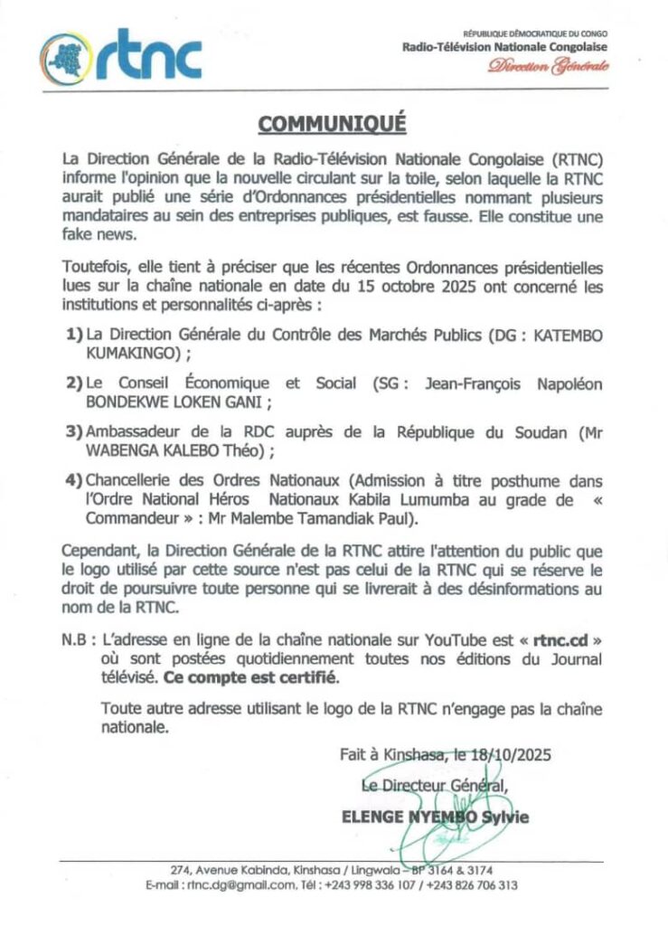 Fake-News sur les nominations des mandataires publics: Le logo utilisé par cette source n’est pas celui de la RTNC qui se réserve le droit de poursuivre en justice toute personne qui se livrerait à des désinformations à son nom ( Communiqué Direction Générale)