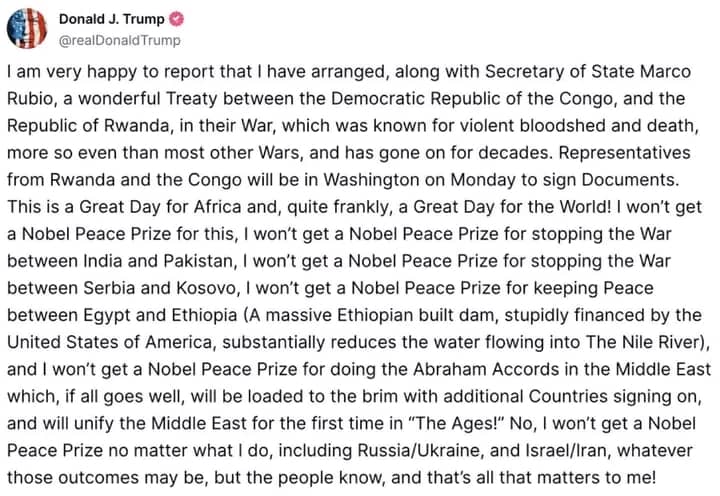 Guerre d’agression: Le Président americain Donald Trump salue l’accord de paix paraphé entre la RDC et le Rwanda en attendant la signature