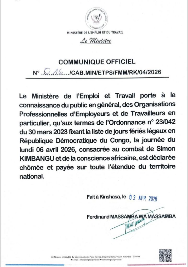 AccueilA la UneHommages à Simon Kimbangu : La journée du lundi 6 avril déclarée... A la UneBreaking NewsSociété Hommages à Simon Kimbangu : La journée du lundi 6 avril déclarée chômée et payée ( gouvernement) By redaction 2 avril 2026 0 0 Partager FacebookTwitterPinterestWhatsApp Partager FacebookTwitterPinterestWhatsApp Article précédentQualification au Mondial 2026 : les Léopards arrivent à Kinshasa ce samedi 4 avril, le gouvernement appelle à un accueil mémorable (Patrick Muyaya)Article suivantKwango : Validation de 30 infrastructures communautaires dans le cadre du projet STAR-RDC redactionhttp://www.rtnc.cd RELATED ARTICLES A la Une Kwango : Validation de 30 infrastructures communautaires dans le cadre du projet STAR-RDC 2 avril 2026 A la Une Qualification au Mondial 2026 : les Léopards arrivent à Kinshasa ce samedi 4 avril, le gouvernement appelle à un accueil mémorable (Patrick Muyaya) 2 avril 2026 A la Une Élection du deuxième vice-président du Sénat : Norbert Basengezi, l’unique candidat à ce poste (commission spéciale) 2 avril 2026 LAISSER UN COMMENTAIRE Annuler la réponse Commenter : S'il vous plaît entrez votre commentaire! Nom :* S'il vous plaît entrez votre nom ici Email :* Vous avez entré une adresse email incorrecte! Veuillez entrer votre adresse email ici Site : Enregistrer mon nom, email et site web dans ce navigateur pour la prochaine fois que je commenterai. - Advertisment - Most Popular Kwango : Validation de 30 infrastructures communautaires dans le cadre du projet STAR-RDC 2 avril 2026 Qualification au Mondial 2026 : les Léopards arrivent à Kinshasa ce samedi 4 avril, le gouvernement appelle à un accueil mémorable (Patrick Muyaya) 2 avril 2026 Élection du deuxième vice-président du Sénat : Norbert Basengezi, l’unique candidat à ce poste (commission spéciale) 2 avril 2026 Guerre au Moyen-Orient : Le Président Tshisekedi à Doha pour témoigner la solidarité du peuple congolais à l’égard du peuple qatari 2 avril 2026 Voir plus Recent Comments Our gallery They say that a picture is worth a thousand words, so that's why we always want to document our campaigns. Immerse yourself in our past projects, with these wonderful images taken by our volunteer photographers. VIEW GALLERY
