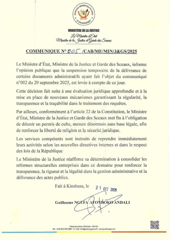 AccueilA la UneJustice : Levée de la suspension temporaire en rapport avec la délivrance... A la UneJustice Justice : Levée de la suspension temporaire en rapport avec la délivrance de certains documents administratifs ( Communiqué) By redaction 21 octobre 2025 0 0 Partager FacebookTwitterPinterestWhatsApp Partager FacebookTwitterPinterestWhatsApp Article précédentRespect des engagements sociaux : Le VPM Adolphe Muzito exige l’actualisation du barème salarial 2021 de la RTNC dans le budget 2026Article suivantAgriculture: La province de Mongala réceptionne 6 tracteurs et un lot d’intrants redactionhttp://www.rtnc.cd RELATED ARTICLES A la Une Kasaï Central : le Gouverneur arrache le financement du projet Barrage Mbombo lors du forum national des affaires coutumières 9 mars 2026 A la Une Sud-Ubangi : Célébration de la journée mondiale des droits de la femme 9 mars 2026 A la Une Mongala : la commune affiche un nouveau visage de l’année fiscale, de la brigade d’assainissement et la numérotation des parcelles 9 mars 2026 LAISSER UN COMMENTAIRE Annuler la réponse Commenter : S'il vous plaît entrez votre commentaire! Nom :* S'il vous plaît entrez votre nom ici Email :* Vous avez entré une adresse email incorrecte! Veuillez entrer votre adresse email ici Site : Enregistrer mon nom, email et site web dans ce navigateur pour la prochaine fois que je commenterai. - Advertisment - Most Popular Kasaï Central : le Gouverneur arrache le financement du projet Barrage Mbombo lors du forum national des affaires coutumières 9 mars 2026 Sud-Ubangi : Célébration de la journée mondiale des droits de la femme 9 mars 2026 Mongala : la commune affiche un nouveau visage de l’année fiscale, de la brigade d’assainissement et la numérotation des parcelles 9 mars 2026 Kenge : les policières et épouses des policiers du Kwango célèbrent la Journée internationale des droits de la femme 9 mars 2026 Voir plus Recent Comments Our gallery They say that a picture is worth a thousand words, so that's why we always want to document our campaigns. Immerse yourself in our past projects, with these wonderful images taken by our volunteer photographers. VIEW GALLERY