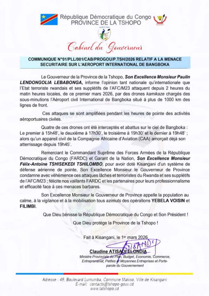 Selon la déclaration officielle, les hostilités ont débuté à 2 heures du matin, ce dimanche 1er mars 2026. Des drones kamikazes chargés de sous-munitions auraient ciblé l’aéroport de Bangoka, infrastructure stratégique située à plus de 1 000 kilomètres des lignes de front actives dans l’Est du pays. Les autorités provinciales dénoncent une opération « terroriste » visant une installation civile en pleine activité.