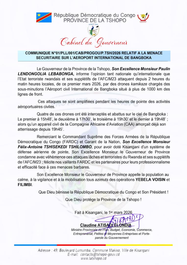 Dans un message solennel lu dimanche soir sur les antennes de la RTNC Kisangani par sa porte-parole, la ministre provinciale Claudine Atisady Elondja, le gouvernement provincial de la Tshopo a accusé le Rwanda et ses « supplétifs de l’AFC/M23 » d’avoir mené une attaque par drones contre l’aéroport civil international de Bangoka.