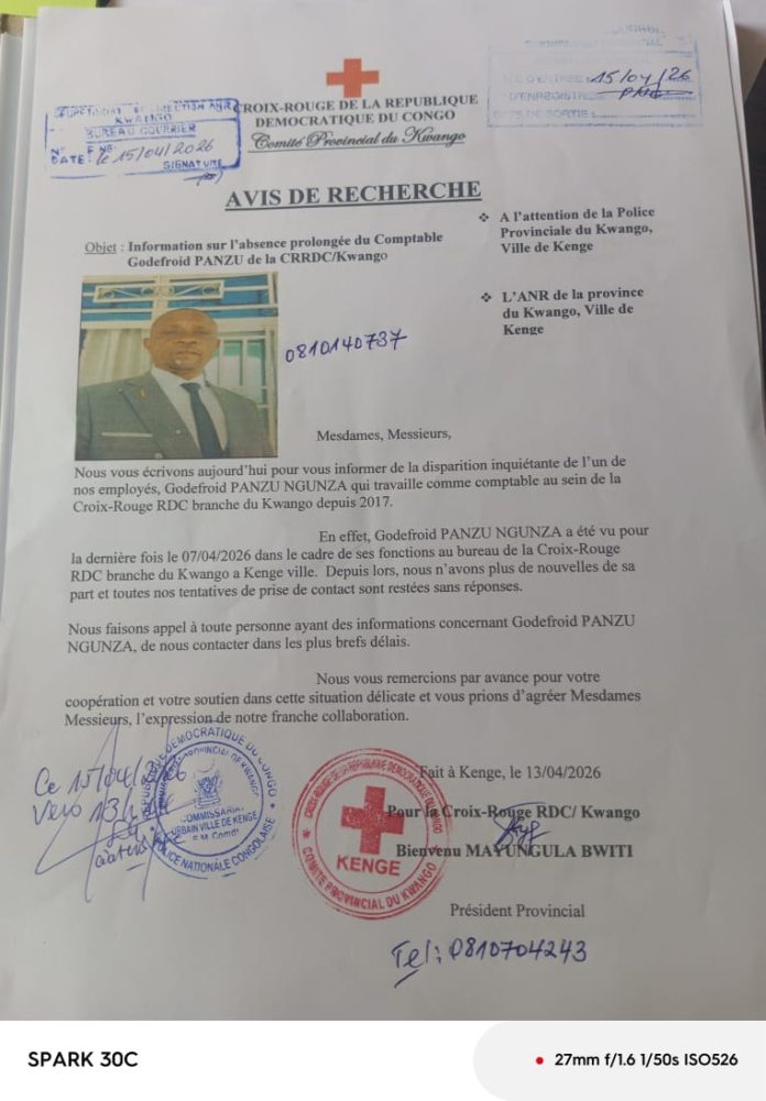 Le Comité provincial du Kwango de la Croix-Rouge de la République Démocratique du Congo a officiellement lancé un avis de recherche relatif à la disparition de son comptable, Godefroid Panzu Ngunza, en poste depuis 2017.