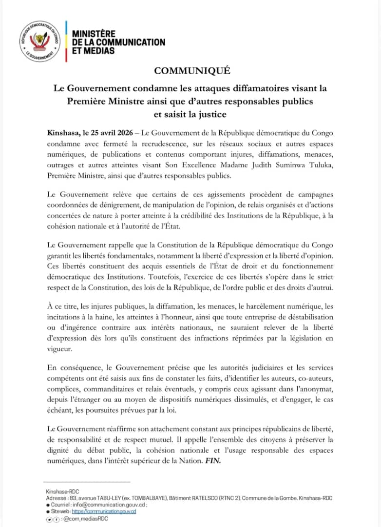 AccueilA la UneLe Gouvernement dénonce avec fermeté les attaques diffamatoires visant la Première Ministre... A la UneInstitutions Le Gouvernement dénonce avec fermeté les attaques diffamatoires visant la Première Ministre et d’autres responsables publics( Communiqué ) By redaction 25 avril 2026 0 0 Partager FacebookTwitterPinterestWhatsApp Partager FacebookTwitterPinterestWhatsApp Article précédentMai-Ndombe : la NSCC et les confessions religieuses sollicitent un appui pour l’organisation d’un forum de paix et de réconciliationArticle suivantSankuru : la population dénonce l’impraticabilité de la route pour accéder au chef-lieu de la province redactionhttp://www.rtnc.cd RELATED ARTICLES A la Une Coopération : le Gouvernement réaffirme la disponibilité des autorités d’accompagner les investisseurs et d’améliorer le climat des affaires 25 avril 2026 A la Une RDC: 100 millions en voie d’être mobilisés par l’Italie pour le secteur de l’eau 25 avril 2026 A la Une Ituri: Fridolin Ambongo lance un appel fort de la paix à Bunia 25 avril 2026 LAISSER UN COMMENTAIRE Annuler la réponse Commenter : S'il vous plaît entrez votre commentaire! Nom :* S'il vous plaît entrez votre nom ici Email :* Vous avez entré une adresse email incorrecte! Veuillez entrer votre adresse email ici Site : Enregistrer mon nom, email et site web dans ce navigateur pour la prochaine fois que je commenterai. - Advertisment - Most Popular Coopération : le Gouvernement réaffirme la disponibilité des autorités d’accompagner les investisseurs et d’améliorer le climat des affaires 25 avril 2026 RDC: 100 millions en voie d’être mobilisés par l’Italie pour le secteur de l’eau 25 avril 2026 Ituri: Fridolin Ambongo lance un appel fort de la paix à Bunia 25 avril 2026 Lodja : la province éducationnelle Sankuru 1 renoue avec la remise des bulletins scolaires 25 avril 2026 Voir plus Recent Comments Our gallery They say that a picture is worth a thousand words, so that's why we always want to document our campaigns. Immerse yourself in our past projects, with these wonderful images taken by our volunteer photographers. VIEW GALLERY