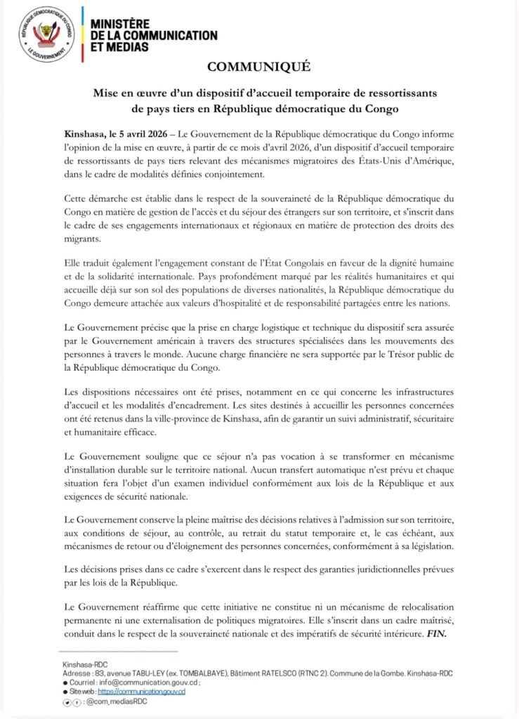 AccueilA la UnePartenariat RDC-USA :Le gouvernement annonce la mise en œuvre d'un dispositif d’accueil... A la UneAfrique-mondeBreaking News Partenariat RDC-USA :Le gouvernement annonce la mise en œuvre d’un dispositif d’accueil temporaire pour les ressortissants de pays tiers (Communiqué) By redaction 5 avril 2026 0 0 Partager FacebookTwitterPinterestWhatsApp Partager FacebookTwitterPinterestWhatsApp Article précédentLa RDC accueille ses mondialistes « héroïques »Article suivantParcelles de terrain, primes et véhicules : Le cadeau du Président Tshisekedi aux Léopards après leur qualification historique au Mondial redactionhttp://www.rtnc.cd RELATED ARTICLES A la Une Ituri : Louis Watum en mission à Bunia pour assainir le secteur minier 20 avril 2026 A la Une Kasaï-Central : Les travaux de la réhabilitation du pont Katusenga à Demba évoluent sans désamparer 20 avril 2026 A la Une Tanganyika/sports ; le VC Lukuga lance une nouvelle dynamique pour professionnaliser la discipline 20 avril 2026 LAISSER UN COMMENTAIRE Annuler la réponse Commenter : S'il vous plaît entrez votre commentaire! Nom :* S'il vous plaît entrez votre nom ici Email :* Vous avez entré une adresse email incorrecte! Veuillez entrer votre adresse email ici Site : Enregistrer mon nom, email et site web dans ce navigateur pour la prochaine fois que je commenterai. - Advertisment - Most Popular Ituri : Louis Watum en mission à Bunia pour assainir le secteur minier 20 avril 2026 Kasaï-Central : Les travaux de la réhabilitation du pont Katusenga à Demba évoluent sans désamparer 20 avril 2026 Tanganyika/sports ; le VC Lukuga lance une nouvelle dynamique pour professionnaliser la discipline 20 avril 2026 Tanganyika : le HCR mise sur la réduction de la dépendance à l’aide humanitaire dans sa nouvelle stratégie (2027-2030) 20 avril 2026 Voir plus Recent Comments Our gallery They say that a picture is worth a thousand words, so that's why we always want to document our campaigns. Immerse yourself in our past projects, with these wonderful images taken by our volunteer photographers. VIEW GALLERY