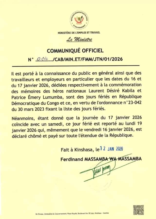 AccueilA la UneRDC: la journée du 17 janvier tombant un samedi, le jour férié... A la UneInstitutions RDC: la journée du 17 janvier tombant un samedi, le jour férié est reporté au lundi 19 janvier (Communiqué) By redaction 12 janvier 2026 0 0 Partager FacebookTwitterPinterestWhatsApp Partager FacebookTwitterPinterestWhatsApp Article précédentTshuapa : Décès de la Sœur Renate Benkanga à BokunguArticle suivantTshopo : Dix présumés criminels présentés à la presse par la PNC redactionhttp://www.rtnc.cd RELATED ARTICLES A la Une Tshuapa : Lancement des travaux de désherbage de la piste de l’aéroport de Boende 20 janvier 2026 A la Une Finale CAN Maroc : La FECOFA salue le professionalisme du trio arbitral Ndala – Ngila – Mbilizi 20 janvier 2026 A la Une Mai-Ndombe : Le gouvernement provincial renforce les stratégies de commercialisation des œufs 20 janvier 2026 LAISSER UN COMMENTAIRE Annuler la réponse Commenter : S'il vous plaît entrez votre commentaire! Nom :* S'il vous plaît entrez votre nom ici Email :* Vous avez entré une adresse email incorrecte! Veuillez entrer votre adresse email ici Site : Enregistrer mon nom, email et site web dans ce navigateur pour la prochaine fois que je commenterai. - Advertisment - Most Popular Tshuapa : Lancement des travaux de désherbage de la piste de l’aéroport de Boende 20 janvier 2026 Finale CAN Maroc : La FECOFA salue le professionalisme du trio arbitral Ndala – Ngila – Mbilizi 20 janvier 2026 Mai-Ndombe : Le gouvernement provincial renforce les stratégies de commercialisation des œufs 20 janvier 2026 Lodja : L’évêque Vincent Tshomba visite le lycée Lokenye, victime de vandalisme 20 janvier 2026 Voir plus Recent Comments Our gallery They say that a picture is worth a thousand words, so that's why we always want to document our campaigns. Immerse yourself in our past projects, with these wonderful images taken by our volunteer photographers. VIEW GALLERY