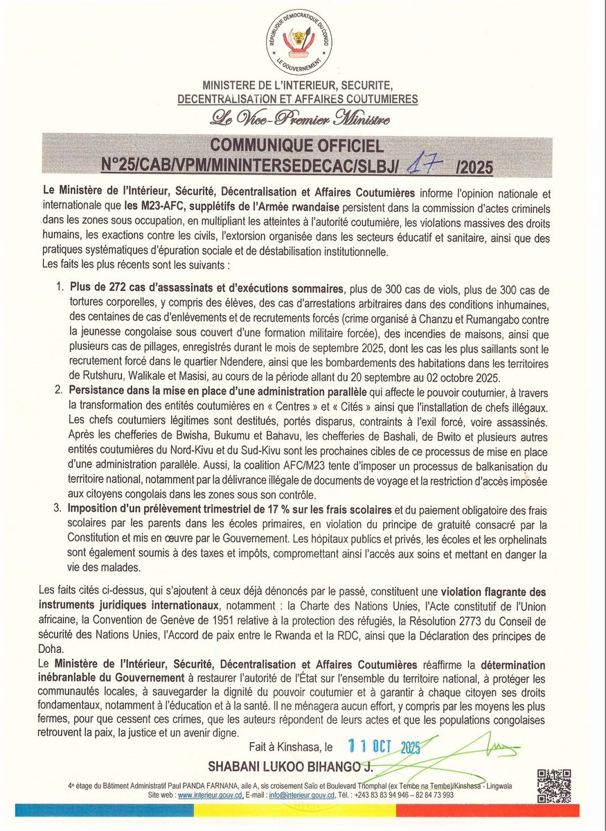AccueilA la UneRDC : Plus de 272 cas d’assassinats et d’exécutions sommaires entre le... A la UneSécurité RDC : Plus de 272 cas d’assassinats et d’exécutions sommaires entre le 20 septembre et le 02 octobre dans les zones sous occupation rwandaise (Gouvernement) By redaction 11 octobre 2025 0 0 Partager FacebookTwitterPinterestWhatsApp Partager FacebookTwitterPinterestWhatsApp Article précédentAgression rwandaise : Les USA saluent la main tendue du Président Tshisekedi à son homologue Kagame pour la paixArticle suivantKongo-Central : Victor Nsuami Mpaka élu président de l’Assemblée provinciale redactionhttp://www.rtnc.cd RELATED ARTICLES A la Une Sankuru : Candidat unique, Emile Kutshakoy élu bâtonnier du barreau 15 octobre 2025 A la Une Elections aux barreaux de Kinshasa Gombe et Matete : Vers un second tour pour départager les candidats au bâtonnat 15 octobre 2025 A la Une Lutte contre l’insécurité alimentaire au Kasaï-Central : Lancement de la campagne agricole 2025–2026 à Kazumba 15 octobre 2025 LAISSER UN COMMENTAIRE Annuler la réponse Commenter : S'il vous plaît entrez votre commentaire! Nom :* S'il vous plaît entrez votre nom ici Email :* Vous avez entré une adresse email incorrecte! Veuillez entrer votre adresse email ici Site : Enregistrer mon nom, email et site web dans ce navigateur pour la prochaine fois que je commenterai. - Advertisment - Most Popular Sankuru : Candidat unique, Emile Kutshakoy élu bâtonnier du barreau 15 octobre 2025 Elections aux barreaux de Kinshasa Gombe et Matete : Vers un second tour pour départager les candidats au bâtonnat 15 octobre 2025 Lutte contre l’insécurité alimentaire au Kasaï-Central : Lancement de la campagne agricole 2025–2026 à Kazumba 15 octobre 2025 Lodja : Une ONG sensibilise sur la lutte contre la sous-alimentation et la protection de l’environnement 14 octobre 2025 Voir plus Recent Comments