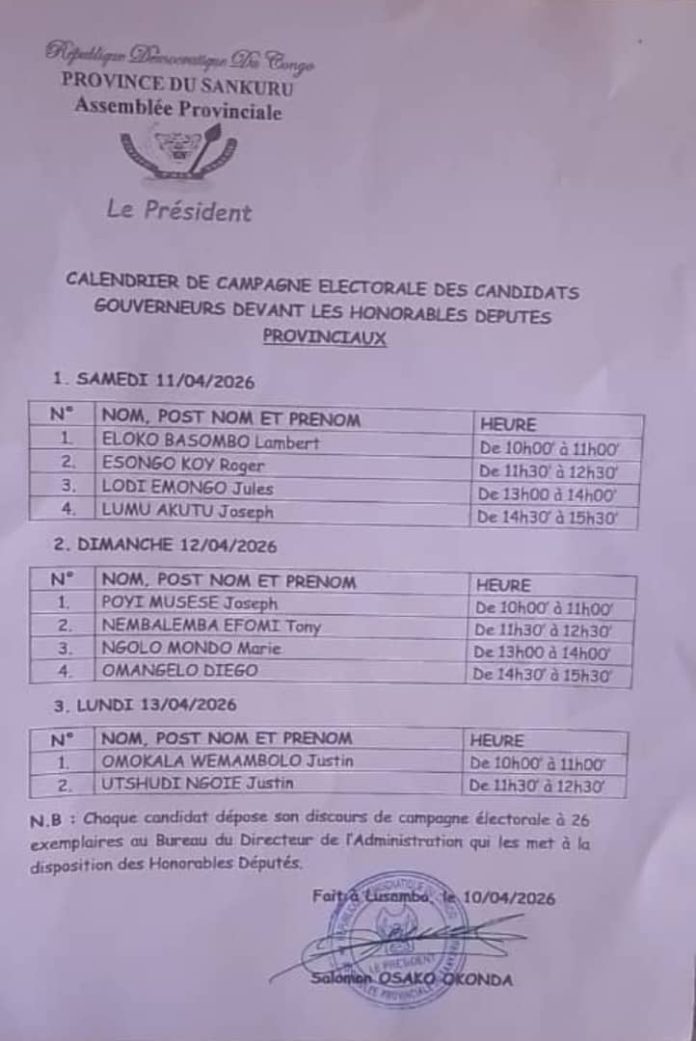 L’Assemblée provinciale du Sankuru a rendu public ce 10 avril 2026,le calendrier officiel de la campagne électorale en prélude à l’élection du gouverneur et du vice-gouverneur de province.