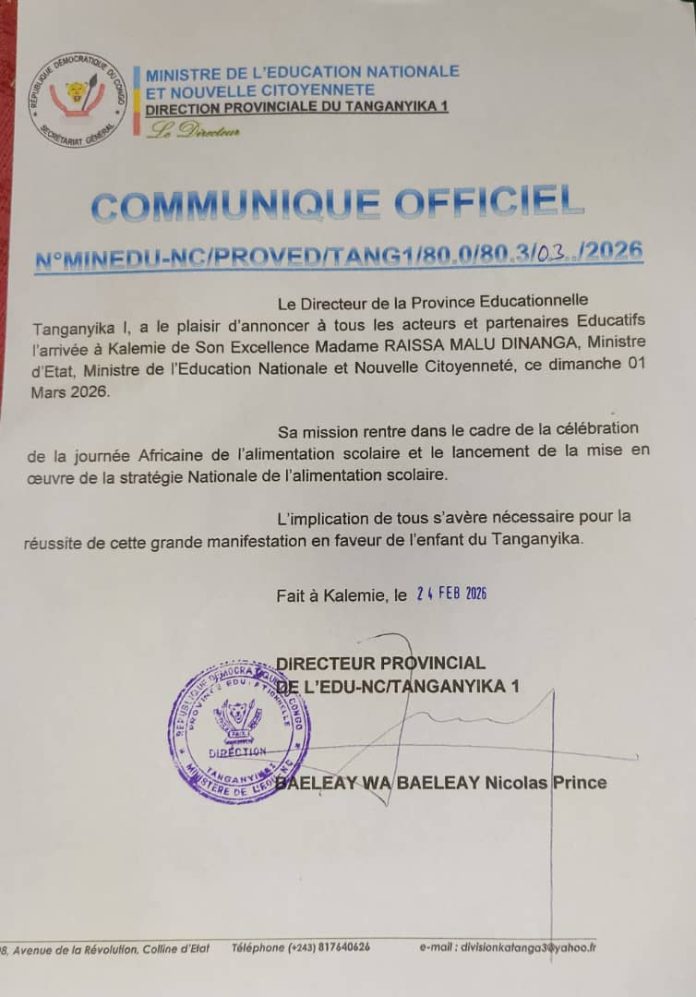 À travers son communiqué N° MINEDU-NC/PROVED/TANG1/80.03/03/2026, signé le 24 février 2026, adressé à tous les acteurs et partenaires éducatifs, l’arrivée à Kalemie de Madame Raissa Malu Dinanga, Ministre d’État, Ministre de l’Éducation Nationale et de la Nouvelle Citoyenneté accompagnée d’une forte délégation est prévue pour ce dimanche 1er mars 2026.