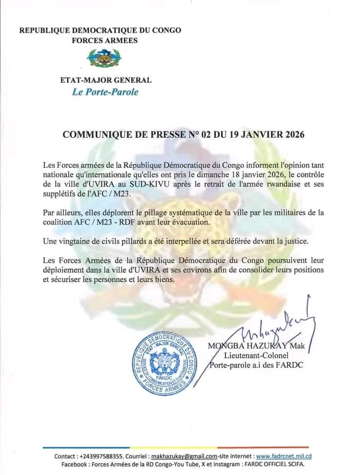 AccueilA la UneUvira : Les FARDC déplorent des actes de pillage systématique commis par... A la UneBreaking NewsSécurité Uvira : Les FARDC déplorent des actes de pillage systématique commis par la coalition terroriste RDF-AFC-M23 ( Communiqué) By redaction 19 janvier 2026 0 0 Partager FacebookTwitterPinterestWhatsApp Partager FacebookTwitterPinterestWhatsApp Article précédentTransports à Kinshasa : l’hôtel de ville renforce avec des mesures fermes pour un retour à l’ordreArticle suivantGuerre à l’Est de la RDC : Kinshasa annonce la mise en œuvre d’un plan de restauration progressive de l’autorité de l’État à Uvira et ses environs redactionhttp://www.rtnc.cd RELATED ARTICLES A la Une Guerre à l’Est de la RDC : Kinshasa annonce la mise en œuvre d’un plan de restauration progressive de l’autorité de l’État à Uvira... 19 janvier 2026 A la Une Transports à Kinshasa : l’hôtel de ville renforce avec des mesures fermes pour un retour à l’ordre 19 janvier 2026 A la Une Ouganda : le Président Tshisekedi félicite son homologue Museveni pour sa réélection 19 janvier 2026 LAISSER UN COMMENTAIRE Annuler la réponse Commenter : S'il vous plaît entrez votre commentaire! Nom :* S'il vous plaît entrez votre nom ici Email :* Vous avez entré une adresse email incorrecte! Veuillez entrer votre adresse email ici Site : Enregistrer mon nom, email et site web dans ce navigateur pour la prochaine fois que je commenterai. - Advertisment - Most Popular Guerre à l’Est de la RDC : Kinshasa annonce la mise en œuvre d’un plan de restauration progressive de l’autorité de l’État à Uvira... 19 janvier 2026 Transports à Kinshasa : l’hôtel de ville renforce avec des mesures fermes pour un retour à l’ordre 19 janvier 2026 Ouganda : le Président Tshisekedi félicite son homologue Museveni pour sa réélection 19 janvier 2026 Inongo : L’absence de la connexion Vodacom bouleverse la situation socio-économique 19 janvier 2026 Voir plus Recent Comments Our gallery They say that a picture is worth a thousand words, so that's why we always want to document our campaigns. Immerse yourself in our past projects, with these wonderful images taken by our volunteer photographers. VIEW GALLERY